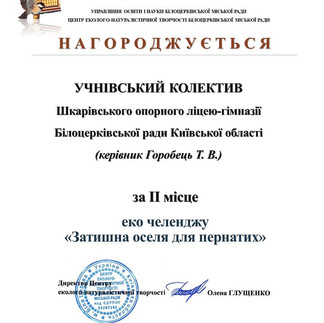 Щедрим на перемоги виявився для наших ліцеїстів відео-челендж "Затишна оселя для пернатих". У період з 11 по 31 січня 2023 року, для здобувачів освіти закладів загальної середньої середньої та позашкільної освіти Білоцерківської міської територіальної громади, з метою виховання шанобливого ставлення до біорізноманіття рідного краю, гуманного ставлення до птахів, мотивації до охорони природи Центром еколого-натуралістичної творчості Білоцерківської міської ради було ініційовано проведення еко-челенджу «Затишна оселя для пернатих».